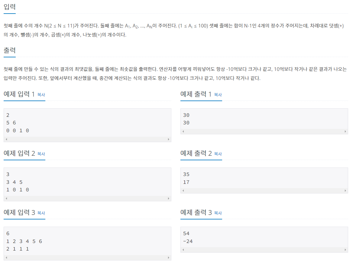 이번에는 백트래킹 문제 중 삼성 SW 역량 테스트 기출문제 1번인 "연산자 끼워넣기" 문제를 풀었다.