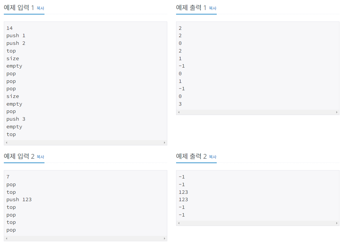입력받은 명령 (push, pop, size, empty, top) 에 맞게