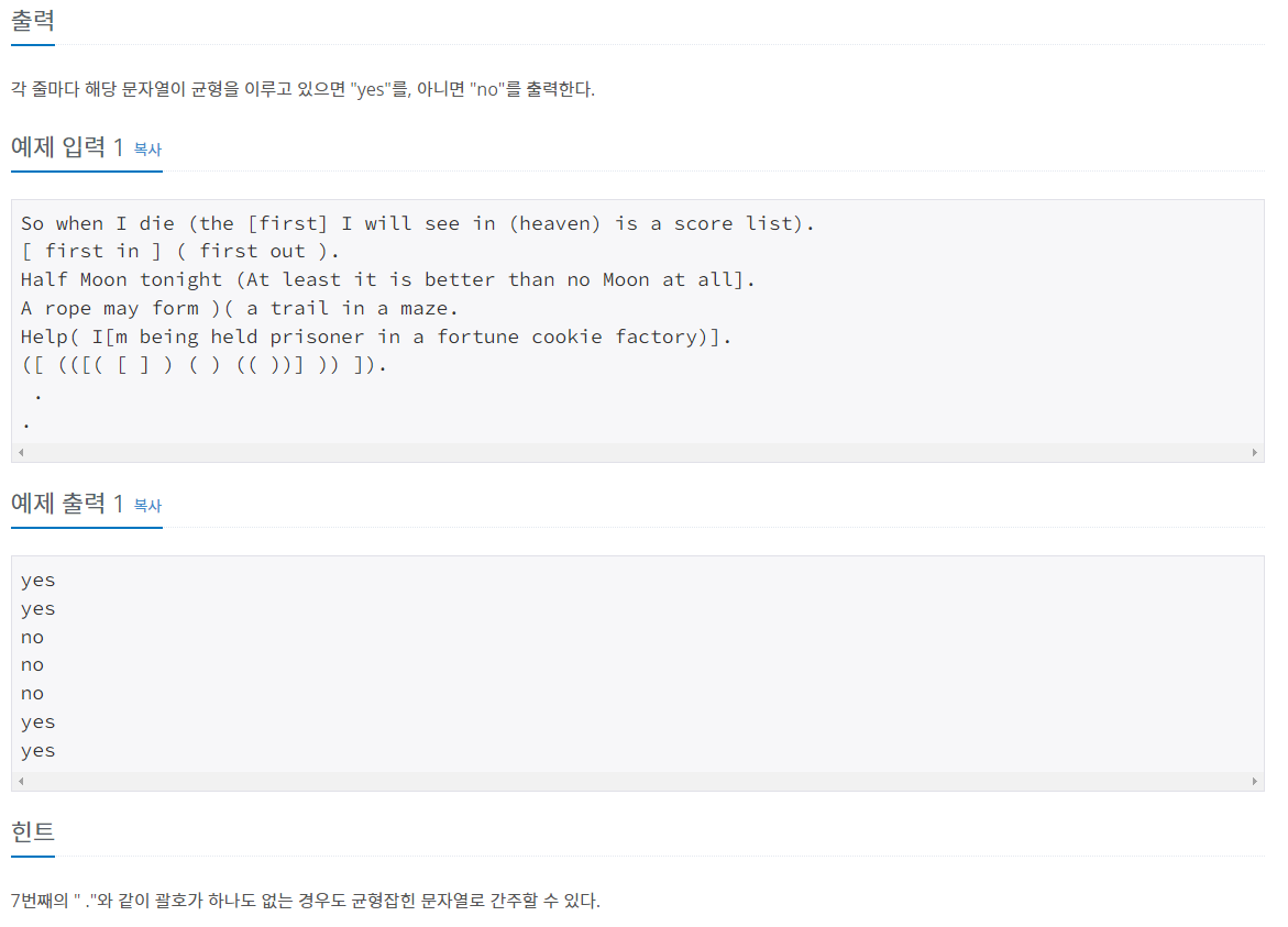 하나 또는 여러줄에 걸쳐서 문자열이 주어진다. 각 문자열은 영문 알파벳, 공백, 소괄호("( )") 대괄호("[ ]")등으로 이루어져 있으며, 길이는 100글자보다 작거나 같다. 각 줄은 마침표(".")로 끝난다