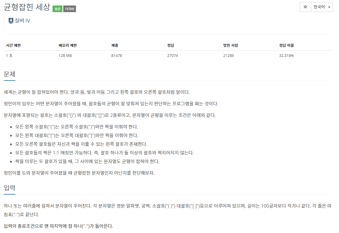 4번째 문제인 4949번 : 균형잡힌 세상 을 풀었다.