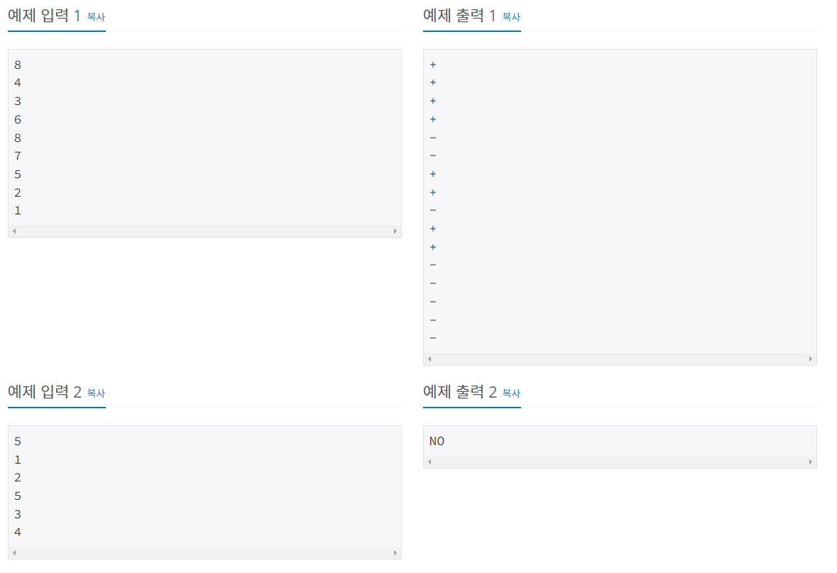 - 수열을 나타낼 수 있으면 push 연산은 + , pop 연산은 - 을 출력