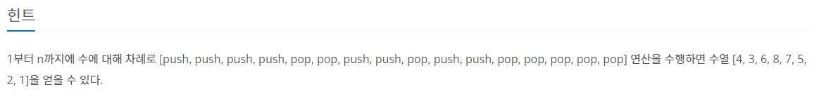 1부터 n까지에 수에 대해 차례로 [push, push, push, push, pop, pop, push, push, pop, push, push, pop, pop, pop, pop, pop] 연산을 수행하면 수열 [4, 3, 6, 8, 7, 5, 2, 1]을 얻을 수 있다.
